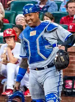 On April 13, Perez hit his 250th career home run, becoming the 12th primary catcher in AL/NL history to reach that milestone.[62] On July 7, he earned his 1,500th base hit.[63] He finished the season with a career high 44 walks. He batted .271/.330/.456 with 27 home runs and 104 RBI. He ranked first among all qualified American League catchers (minimum 50% games at catcher) in RBIs, on-base percentage, slugging percentage, on-base plus slugging, and extra-base hits, second in batting average and hits, and third in home runs, while winning his fifth Silver Slugger award.[64][65]