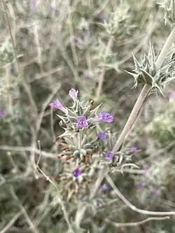 Flowers are borne in interrupted clusters along the stem branches. Each flower has a double-lipped tubular corolla about a centimeter long in a shade of pinkish purple. The corolla is surrounded by spiny sepals.[2] It is aromatic.[1]