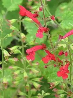 Salvia roemeriana (cedar sage, 'dwarf crimson-flowered sage') is a herbaceous perennial shrub native to the Edwards Plateau in Texas, along with parts of Arizona, and several states in Mexico. The epithet honors German geologist Ferdinand von Roemer, who lived in Texas from 1845 to 1847 and became known as the "father of Texas geology". The common name refers to the cedar brakes where it commonly grows. It also grows in oak woodlands and rock outcroppings. It was introduced into horticulture in 1852, and was a favorite of renowned garden writer William Robinson for its neatness as an edging plant and in front of borders.[1]