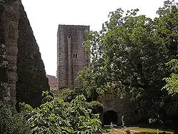 View through the main gate into the castle court. Right: the neo-Romanesque castle chapel -
