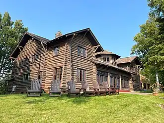 The lodge is a rectangular, two-story structure built of logs on the northern section of Lake Michigamme. The front facade is symmetrical with an enclosed central entrance porch, surmounted by a central dormer and flanked by two-story gable bays. The rear facade is asymmetrical with an intersecting gable over a centrally located balconette, and a rear entry. The lodge is built from locally furnished materials and features rustic ornamentation. The interior has a two-story great room, with the remainder of the rooms arranged in a surrounding U-shape.