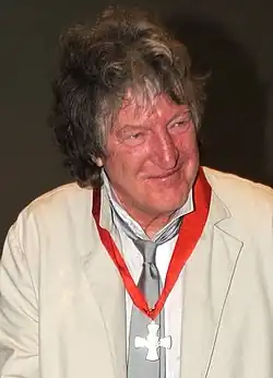 Hunt's distinctive appearance – tall and thin, usually wearing long, tight, trousers ("Foxton straights" he has called them) with vests and open-chested shirts, with long hair curling wildly above a well-worn face – is complemented by the familiar gravelly drawl, the rhythmic, sometimes staccato and sometimes incantatory quality of his recitation (often tapping his fingers or flicking a hand to emphasise the poetic beat) and the execution of occasional small dance-like steps of concentration. These have all made him one of New Zealand's most recognisable figures.[3] Once, almost as well-known was his long-time travelling companion, the dog Minstrel. "A bard in the truest sense of the itinerant minstrel, Hunt's turangawaewae [i.e. 'one's own turf', literally: 'a place to stand'] is the public bar. Touring the pubs with bands of musos[22] and poets, he is himself one of the national icons".[23] Hunt is also a familiar figure in New Zealand figurative art, notably in paintings by Robin White, such as in Sam Hunt at the Portobello Pub,[24] painted in 1978.[23] In 2012, the artist Dick Frizzell completed a series of paintings of Sam Hunt poems. At the opening of the exhibition of those paintings on 7 February 2012, Frizzell said that he and Hunt had, in their respective paintings and poems, committed the ultimate "sin", the "sin of being understood".[25] [26]