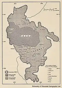 The Mbughu, an immigrant Cushitic pastoralist group, threatened the small clan-chiefdoms that Shambaa had initially established since their tribal structures were incompatible with the local cultivators' organization. Tradition holds that Mbegha, the roving hunter from Ungulu, was the old culture's savior.[13]