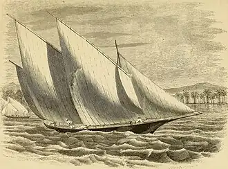 A book by G. W. Earl from 1837 provides an early description of the sampan panjang. At that time the boat was 30 ft (9 m) long and 4 ft (1.2 m) wide. It had two masts with large lateens, loose-footed dipping lugsails. It was steered using a long, diamond-shaped paddle, which could also be used to increase speed. It carried five crewmen.[5]
