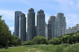 The Samsung Tower Palace (Korean: 삼성 타워팰리스) is a group of seven towers, lettered A-G. They are located in Dogok-dong, Gangnam District, Seoul, South Korea. They range from 42 to 72 floors, all built between 2002 and 2004, and all used as luxury residential complexes. Tower Palace "G", which is 73 floors and 264 metres (866 feet) high, was the tallest building in Korea since 2004 but was surpassed by the Northeast Asia Trade Tower in 2009. Its shape is formed by three oval lobes joined together. They are named for the company Samsung.[1]