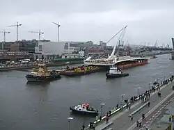 The steel structure of the bridge was constructed in Rotterdam by Hollandia,[7] a Dutch company also responsible for the steel fabrication of the London Eye.[8] The steel span of the bridge was transferred from the Hollandia wharf in Krimpen aan den IJssel on 3 May 2009,[7][9] with support from specialist transport company ALE Heavylift.