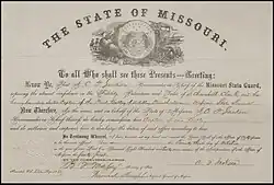 - ^ Jackson, Claiborne Fox, 1806-1862, (1861-10-23) Appointment of Samuel Churchill Clark as captain of the First Battery of Artillery, 4th Division, Missouri State Guard, signed Claiborne F. Jackson, governor and commander of the Missouri State Guard, October 23, 1861. Retrieved from the Digital Public Library of America, https://mohistory.org/collections/item/A0289-30924