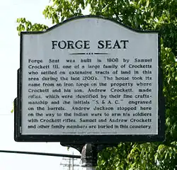 Andrew Crocket, Samuel's father, received a 640-acre (260 ha) grant for Revolutionary War services. He built his first log home on the southeast side of what is now Brentwood in 1799. His son, Samuel Crockett built a two-story brick home nearby, which was completed ca. 1808. The home became known as "Forge Seat" because of the iron forge located on the property. Samuel Crockett and his son, Andrew, made iron implements here and specialized in rifle making.[2] Crockett's rifles "were identified by their fine craftsmanship and the initials 'S. & A. C.' engraved on the barrels."[3] On his way to New Orleans and the War of 1812, Andrew Jackson stopped here and purchased rifles to arm his soldiers. It is also said that Davy Crockett stopped on his way to Texas as well.[4]