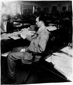 After retiring from the legislature in 1909,[19] Johnson began to buy and sell real estate in addition to farming. He did well in selling real estate, so much so that he hired a local teenager as a chauffeur and paid a staff of cleaning ladies to handle household tasks for his wife.[20] However, Johnson would also lose money, which resulted in the Johnson family living in poverty.[21] He re-invested the profits from real estate into buying local businesses. Johnson bought several ranches, a small movie theater, as well as the only hotel in Johnson City.[20] In 1916, he bought the local newspaper, the Johnson City Record, an "eight page weekly" from its owner. Four months later, Johnson sold the paper to Reverdy Giddon, as many of his subscribers could not pay in cash.[20] Having regained his financial footing, he ran for a third term in 1917.