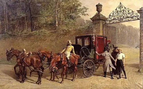 Old English country life strongly attracted his imagination, and furnished him with the romantic incidents which formed the subjects of his most notable pictures, and their backgrounds were frequently taken from Elizabethan houses in his native county or elsewhere in England.