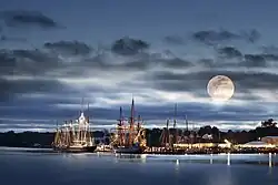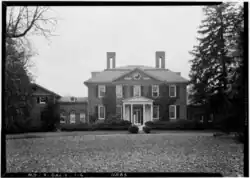 In 1755, Samuel Galloway purchased the 260-acre plantation "Poplar Knowe" from John Talbott.[23] In 1756 he and began construction of a grand plantation house at the site, which he would name Tulip Hill.[1][24] Named for the stands of tulip poplar trees on the property,[25] the Georgian style manor home was designed and furnished in grand style, with imported Delft tile fireplaces and arched chimneys inspired by Virginia's Stratford Hall.[26][27] A tulip motif was found prominently throughout the home.[2] In 1771, George Washington visited Galloway's home Tulip Hill.[28][29] On April 15, 1970, Tulip Hill was named to the National Register of Historic Properties.[30]