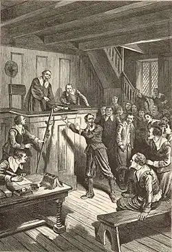 Gorton and others of Shawomet were summoned to the Boston court to answer complaints filed by two minor Indian sachems concerning some "unjust and injurious dealing" towards them. The Shawomet men refused the summons, claiming that they were loyal subjects of the King of England and beyond the jurisdiction of Massachusetts.[14] Soldiers were sent after them, their writings were confiscated, and the men were taken to Boston for trial.[14][21] Once in court, however, the charges against Gorton and the others had nothing to do with the original complaints, but instead were about Gorton's letters, conduct, and religious views. The following charge was made against him: