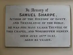 23. ^ Clayden, Peter William (1883). Samuel Sharpe: Egyptologist and Translator of the Bible. K. Paul, Trench & Company. p. 78.