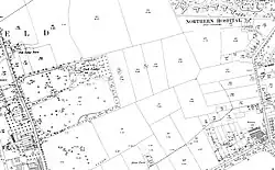 In the late 1860s he purchased a farm and farmhouse on land that was formerly part of Enfield Chase, the royal hunting ground.[6] An Oak Farm is mentioned on an 1822 Ordnance Survey map in that location.[13] Using the services of local builder John Wilkinson, whose office was near the Cherry Tree pub in Southgate, he rebuilt the house into a much more substantial residence known as Oak Lodge with a walled garden, orchard, ice well, and a collection of outbuildings.[14] He made his own gas in an outbuilding at the lodge[6] and a gasometer is shown on contemporary Ordnance Survey maps.
