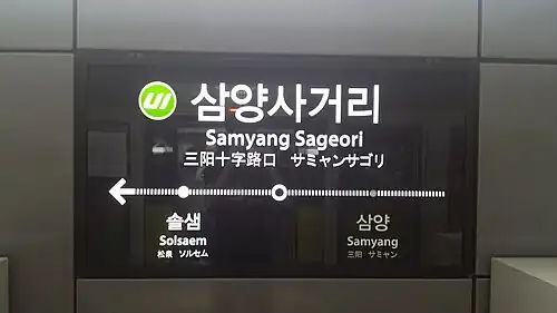 Samyang Sageori Station is a station on the Ui LRT located in Mia-dong, Gangbuk-gu, Seoul.[1][2] It opened on the 2 September 2017.[3]