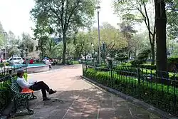 The Plaza de Arcangeles is small and not well known but it is distinct in its abundance of trees and other vegetation. Its name comes from three large sandstone benches with the name of the Archangels Gabriel, Michael and Rafael on them.[3]