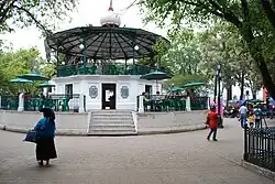 The center of the city is its main plaza. This plaza’s official name is Plaza 31 de marzo, but it is more often simply called the Zócalo. In the colonial era, the city’s main market was here as well as the main water supply.[3] Today, it is centered on a kiosk which was added in the early 20th century. The corners of this structure have inscriptions marking the major events of San Cristóbal’s history. The rest of the plaza is filled with gardens and surrounded by the most important buildings and finest homes from the history of the city. Surrounding this plaza are the city’s most important buildings such as the cathedral and the city hall.[3][5]