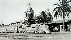 On March 27, 1938, the Santa Fe inaugurated the San Diegan, operating on a schedule of 2+1⁄2 hours. The single equipment set could make two round-trips per day. A second San Diegan consist entered service on June 8, 1941, doubling the schedule to four daily round trips.[7] The San Diegan was supplemented by two conventional heavyweight trains.[8]