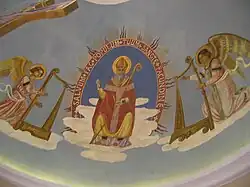 Of the altarpieces now on display are a St Facondino in prayer by Giuseppe Reposati. The former main altarpiece was a 15th-century polyptych depicting an Enthroned Madonna and Child, surrounded by angels, saints and apostles by the Master of Fossato, now on display in the Pinacoteca Civica of Rocca Flea. A codex depicting the life of San Facondino attributed to the same master is now in the Vatican Library.[1]