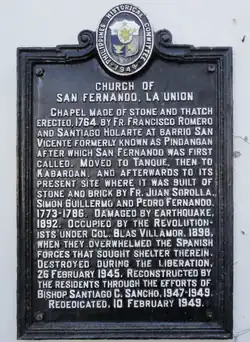 St. William the Hermit Church was originally situated at Pindangan, now known as Barrio San Vicente. In 1759, Augustinian friar Jose Torres convinced the two settlements to fuse into Pindangan (dry fish). He and the natives built a church under the patronage of William the Hermit. In 1765, under its parish priest, Fernando Rey, Pindangan was renamed San Fernando after the Catholic King of Spain.