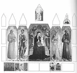 This church was also for centuries the host of the large Gothic-style Borgo San Sepolcro Altarpiece (1437-1444) by the Sienese painter Sassetta. The altarpiece consisted of 60 images and would have stacked up to be some 6 by 5 meters in size. Painted in Siena, costing an exorbitant 510 florins (cost of five houses), it was delivered by cart to Sansepolcro, and assembled in place over the tomb of the Blessed Ranieri Rasini in the church. It was dismembered in 1752. With the Napoleonic suppression of monasteries, the panels were sold. About half of the component panels have been identified among many museums and collections.[3]