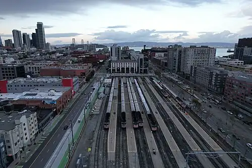 San Francisco 4th and King Street station (previously 4th & Townsend), also known as the Caltrain Depot, is a train station in the SoMa district of San Francisco, California. It is presently the northern terminus of the Caltrain commuter rail line serving the San Francisco Peninsula and Santa Clara Valley. It is also the eastern terminus of the N Judah and E Embarcadero,[a] as well as a stop along the T Third Street of the Muni network. The station is additionally the projected terminus for the first phase of the California High-Speed Rail project and a station once Phase 2 is completed.