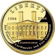 The San Francisco Old Mint Commemorative Coins Act (Pub. L. 109–230 (text) (PDF)) authorized the production of the coin, along with a silver dollar, to mark the centennial of the building's survival of the 1906 San Francisco earthquake and fire. The so-called "Granite Lady" was also viewed as instrumental in helping the city recover from the disaster. The act allowed the coins to be struck in both proof and uncirculated finishes.[1] The coins were released on August 15, 2006.[2]