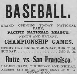 The 1903 San Francisco Pirates hosted home minor league games at National Park. The ballpark was located on the corner of 9th and Bryant Streets.[13][14]