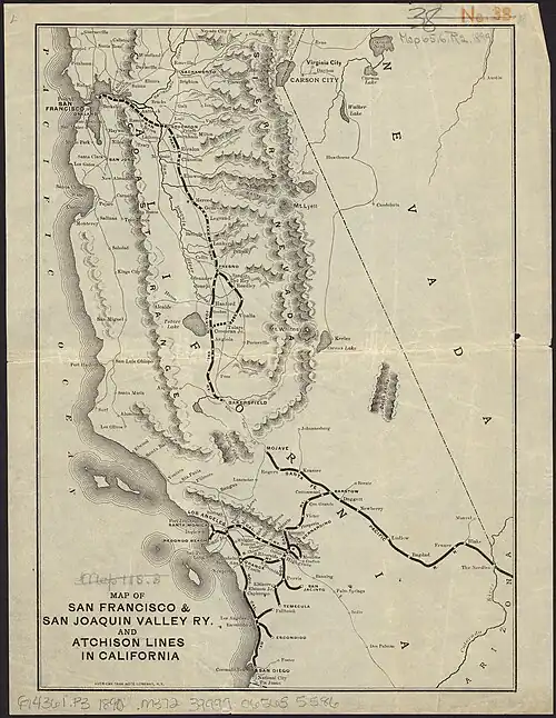 The San Francisco and San Joaquin Valley Railroad was a California rail line between Stockton and Bakersfield constructed in the late 1890s and very shortly thereafter purchased by the Atchison, Topeka and Santa Fe Railroad and became their Valley Division.[1][2]
