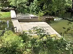 The one remaining complete barrier to salmonid spawning runs on Stanford lands is Searsville Dam. Searsville Dam is located upstream of the San Francisquito Creek mainstem (which is formed by the confluence of Bear Creek and Corte Madera Creek) and blocks its largest tributary, Corte Madera Creek. A May 2002 steelhead trout migration study reported Searsville Dam as a complete barrier to salmonid migration, and that elimination of the Searsville dam could restore ten miles (16 km) of anadromous steelhead habitat.[31] In 2014 a systematic study of 1,400 plus dams in California identified Searsville Dam as a high-priority candidate to improve environmental flows for native fish conservation.[39] In 2015, Stanford University announced plans to eliminate the Searsville Dam as a fish passage barrier by either boring a hole through the base of the dam or allowing the Searsville Reservoir to continue filling with silt and re-route Corte Madera Creek around the dam.[40] Partial barriers to salmonid spawning runs on the San Francisquito Creek mainstem include the USGS stream gage weir and the Stanford's San Francisquito Creek Pump Station two weirs, all located between Junipero Boulevard and Stowe Lane along Alpine Road.