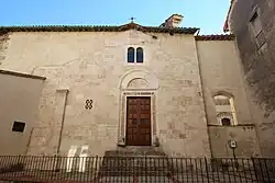 This church was formerly associated with an Augustinian monastery. Inscriptions record that the building was erected in 1199 by the architects Nicola Simone e Bernardo. The portal is carved with decoration. The lunette over the portal includes both Guelf and Ghibelline symbols. The interior has large octagonal pilasters. The main altarpiece depicts a Madonna of the Rosary (1618) by Simone Cibori; the altar on the left has a Madonna della Cintura (Pregnant Madonna) attributed to Giovanni Battista Manna; and the altar on the right has a depiction of Ste Rita of Cascia. The baptismal font dates to the 16th century.[1]