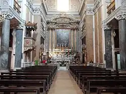 The interior has a paintings of St Ignatius of Loyola by Luca Giordano, Family of the Virgin by Nicola Malinconico, a St Anne and Holy Family by Francesco di Maria.