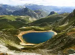 Lago del Ausente also has its own legend, which is about an old Avara woman who lived in a village nestled among rocks. Because of her selfishness, the inhabitants of the village abandoned it, leaving the old woman there alone. One day, a snowstorm surprised her and, without her being able to flee, the village was buried. It is said that on winter nights you can still hear the cries of the old woman who will live forever at the bottom of the Ausente Lake.[24]
