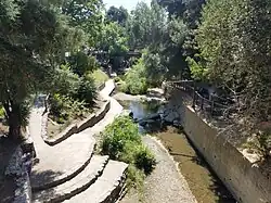 San Luis Obispo Creek begins in the Santa Lucia Mountains, at Cuesta Pass in the Los Padres National Forest.[3] It flows south down a steep canyon below the Cuesta Grade of U.S. Highway 101 and turns to the west after receiving Reservoir Canyon Creek from the left.[3] Entering the city of San Luis Obispo it turns southwest, flowing through residential areas and past San Luis Obispo High School. The creek flows in a man-made channel as it approaches downtown west of Johnson Avenue. At Osos Street it enters a concrete tunnel about 1,000 feet (300 m) long passing beneath downtown San Luis Obispo.[4] After emerging from the tunnel it flows past Mission San Luis Obispo de Tolosa, and then receives Stenner Creek from the right just upstream of Marsh Street.[3]