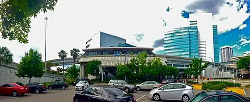 The station at San Marco Boulevard is the first on the Jacksonville Skyway's Southbank extension.[1] It opened on October 30, 1998, and was the southern terminus on the line until the Riverplace and Kings Avenue stations opened two years later. San Marco Station is the first stop reached as the line crosses the St. Johns River over the Acosta Bridge from Central Station. As it stands at the southern approach of the Acosta Bridge, it has an unusual configuration; with its three-story interior concourse it is the highest of all the Skyway stations.[2]