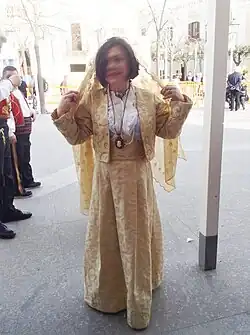 The Papas (Greek Rite Priests) conduct traditional Arbëreshe marriages. The Papas host married couples outside the church and accompany them inside the church, where he puts crowns decorated with coloured ribbons on their heads.[23] The use of the crown was already attested by the Roman writer Tertullian. Although this custom had weakened over the centuries, its importance to wedding ceremonies can still be seen and the term "crown" continued to indicate the sacrament of marriage.[24] During the Eucharist, the Papas give the newlyweds a piece of bread that they both ate in turn three times and a glass of wine from which both took a sip three times. This custom symbolized fidelity: no one else could drink from the same glass. After this ritual, the bride and groom went around the altar three times and the Papas consecrated the successful union. At the end of the ritual, the Papas threw the glass from which he drank to the couple into the baptismal font. As a good omen, the glass was then broken.[25]