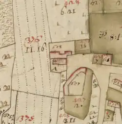 The first clergy house of which we have news dates back to the years in which the Lordship of Milan was increasing its influence on the Municipality of Novara.[36] Specifically, it was described by the curate Uberto Fregonara from Trecate in the Consignationes of 1347, in the list of the church's benefice. It was a sedimen (small house) located immediately north of the church (see map at section 16th-18th century), whose land was bordered to the north and east by the castle's moat. We know the building was composed of a hall, kitchen, two rooms with attic and a farmhouse. To get an idea of its location, just think that where today (2024) the sports field is, there was at that time the clergy house, while near the current cemetery there were the vegetable garden, the vineyard and a well.[37][38][39]