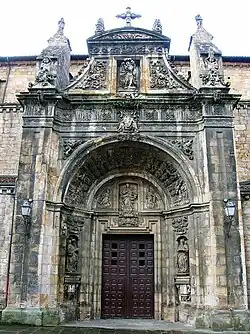 The original temple dates from the 13th century and consisted of a single nave.[2] In the 15th century two more naves were added, the central one being higher than the lateral ones, this work was promoted by the Lords of Oñate. In the 16th century the bishop of Oñati, Rodrigo Mercado de Zuazola, built the cloister, renovated the chapel of La Piedad to be used as his mausoleum and endowed it with a Renaissance altarpiece. In the 15th century the crypt was built to free the space of the Chapel of the Pietà, and in the 18th century the main doorway, the main altarpiece and the choir arch, both Baroque. Before the end of that century the neoclassical tower was added.[3]