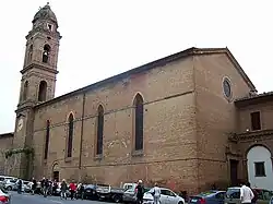 Tradition holds that some hermits lived at the site in 770; the site then acquired an aedicule with the icon of the Mantellini. A church and convent of the Carmelites developed at the site and was documented since about 1265.[1] At this time, the church was outside the walls of the medieval city, outside the Porta de Due Porte, also called the Gate of Stalloregi and the Arco di Santa Lucia. In the 14th-century, the convent was engrossed by the Walls of Siena.[2] The church and bell-tower as we see it today was designed by Baldassare Peruzzi in 1517; work continued on the church until the 17th century. Later it became a military barrack.