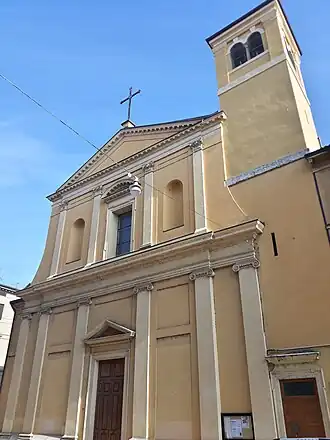 The church was originally built by the Umiliati order in 1188 and dedicated to St Paul Apostle.[1] It was refashioned in 1763 by Alessandro Pompei. In 1948, after much damage during World War II, it again was rebuilt. The second altar on the right has a canvas depicting Saints Anne, Joseph, Young John the Baptist before the Madonna with two donors by Girolamo dai Libri. In the Marogna chapel near the presbytery, are frescoes by Paolo Farinati and an altarpiece depicting the Madonna, John the Baptist, and St Anthony of Padua with two donors of the Marogna family (circa 1565) by Paolo Veronese. The apse has a painting depicting the Madonna with Saints Peter and Paul (1516) by Giovanni Caroto. The fourth altar on the left has a canvas depicting St Francis of Paola by Felice Brusasorci. The second altar on the left has a canvas depicting the Madonna in glory with Saints Nicolò and Francis (1588) by Paolo Farinati. In the sacristy is a canvas depicting the Madonna with St Anthony Abbot and Mary Magdalen by Francesco Bonsignori.[2]