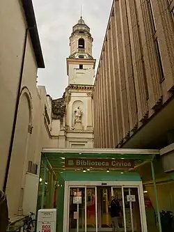 In the early 20th century, the deconsecrated church became a cinema which was known as the Cinema Pathè.[2] By 1939, part of the library moved into the former church. The church was almost completely destroyed by Allied aerial bombardment on 4 January 1945, near the end of World War II. In the 1950s, the façade was relocated to the church of San Nicolò all'Arena and the remains of the church were eventually demolished and replaced by an extension to the library which was designed by the architect Pier Luigi Nervi.[1] This project was approved in 1973[2] and it was completed in 1980.[1] The bell tower which had survived the war was retained and it still exists today.[2]
