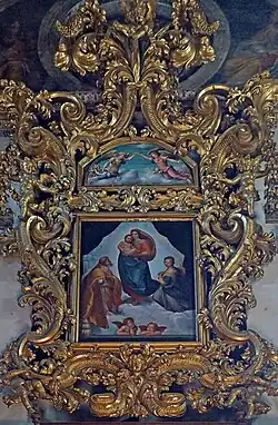At the end of the Nave, in the choir of the apse is a copy of the Raphael's Sistine Madonna attributed to Pietro Antonio Avanzini.[2] To the great loss of Piacenza, the Benedictines pawned off the original in 1754 to Augustus III, King of Poland for the lordly sum of twelve thousand zecchini. The painting is now one of the masterpieces on display at the Gemäldegalerie in Dresden;[3]