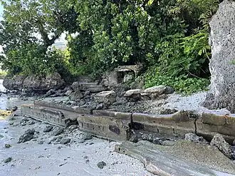 The San Vitores Beach Japanese Fortification are the remains of World War II-era defensive positions facing the beach of Tumon Bay on the west side of the island of Guam. Located near the stairs to the beach of the Guam Reef Hotel are the remains of two concrete pillboxes built by Japanese defenders during the occupation period 1941–44. One structure, of which little more than a gun embrasure is discernible, is located in the limestone cliff about 10 metres (33 ft) inland from the high tide line, and a second is located about 10 meters south and 8 meters further inland, with only a section of roof slab and supporting columns recognizable.[2]