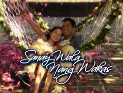 Sana'y Wala Nang Wakas (International title: Timeless / transl. I Hope It Never Ends) is a Philippine television drama series broadcast by ABS-CBN. Directed by Jerome C. Pobocan and FM Reyes, it stars by Jericho Rosales, Kristine Hermosa, Diether Ocampo and Angelika Dela Cruz. It aired on the network's Primetime Bida line up and worldwide on TFC from May 19, 2003 to July 9, 2004, and was replaced by Hiram. It is a love story of two star-crossed lovers who suffer for their parents' long forgotten sins. Christian and Ara battle the odd twists and turns of fate in the hopes of protecting a love that withstands the test of time.