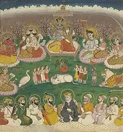 ![]() Sanatan Sikh artwork of the Sikh Gurus with Indic deities, ca.1800–1850 | |