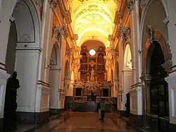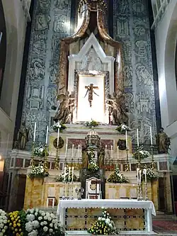 The main altar is adorned with tarsi of the Neapolitan school, which include "typical elements of Arab art": in the central part there is the marble statue of the Madonna delle Grazie, while on its sides the statues, also in marble, of Saint William and Saint Benedict;[22] another noteworthy craftsmanship are the angel-like candelabras, dating back to 1888 and made to replace the original wooden ones. Behind the altar is the walnut wood choir, created by Benvenuto Tortelli in 1573 and characterized by small columns, putti inlaid on the armrests and the Angel with the aspergillum under the central kneeler;[23] The church is closed by an organ by Vincenzo Benvenuti built in 1896.[24]