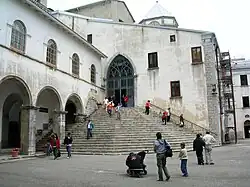 The history of the sanctuary of Montevergine is closely linked to the figure of William of Montevergine, a hermit monk who lived between the 11th and 12th centuries, awho took pilgrimages to places of Christianity.[2] Returning to Italy after a long journey to Santiago de Compostela, he decided to undertake a new pilgrimage to Jerusalem and to prepare himself spiritually he took refuge at Mount Serico, in Atella, where he is the protagonist of the healing of a blind man.[3] Resuming the journey towards the holy land, he arrives in Ginosa, meeting with John of Matera, who advises him to give up the pilgrimage and to work for the divine service in the lands of the West: William refuses the advice of the saint and continues with his I walk until he is beaten up by a group of brigands.[4] Remembering John's words and after a long spiritual reflection, he understands the new path to follow, that is to retire in solitude and devote himself to meditation.[2] Arriving in Irpinia, he feels that God's will is to make him reside on a mountain, known today as Partenio, at an altitude of over a thousand meters.[5]