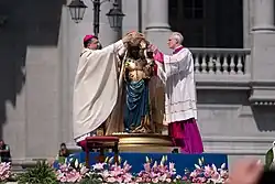 The venerated Marian image was first episcopally crowned by Bishop Giacomo Goria on 30 August 1620. The event is commemorated every 100 years since 1620 with a coronation held on the last Sunday of August. It was postponed for a year in 2020 due to the pandemic. Pope Francis granted an official decree of Pontifical coronation to the image on 5 August 2021, signed and executed by the Dean of the College of Cardinals, Giovanni Battista Re at the Vatican.[8] The coronation was officially carried out on 29 August 2021.