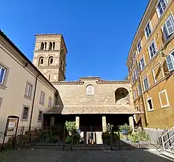 The original floor of the Roman building from the Domitian period was already covered in the Severan period, when with the new adaptation of the building as a spa room a mosaic floor -now moved to the portico in front of the main entrance- raised 12 centimeters above the previous one.[13] Between the fall of the Western Roman Empire and the 11th century, when there is mention of the first consecration of the church, the floor level rose about 1.75 meters:[51] in the fill, emptied during the excavations of 1935-1938, a Roman peperino altar, a layer of toasted wheat grains, even a burial of a Roman legionnaire were found, giving an idea of the multiplicity of functions that the building assumed in the smoky period of the early Middle Ages.[13]