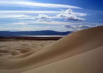 Sand Mountain is a singing sand dune 20 miles (32 km) east of Fallon, Nevada along U.S. Route 50. The dune is two miles long and 600 feet (180 m) high.[2] The full sand field area is 3.25 square miles.[3] The sand originates from the ancient Lake Lahontan, that for the most part dried up 9,000 years ago. Sand Mountain Recreation Area is managed by the Bureau of Land Management and is open to off-highway vehicle use. The area is also the only home of the critically imperiled Sand Mountain blue butterfly. The ruins of the Sand Springs Station of the Pony Express are also located within the recreation area. Sport activities such as sandboarding and sand skiing can be practiced at the site.[4]